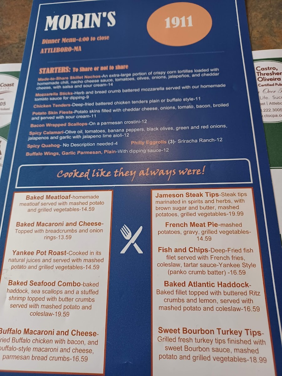 Welcome to Morin's Hometown Bar & Grille, a gastronomic gem located at 16 S Main St, Attleboro, MA. This recently renovated establishment seamlessly blends charm with upscale decor, creating a warm and inviting atmosphere for all diners.